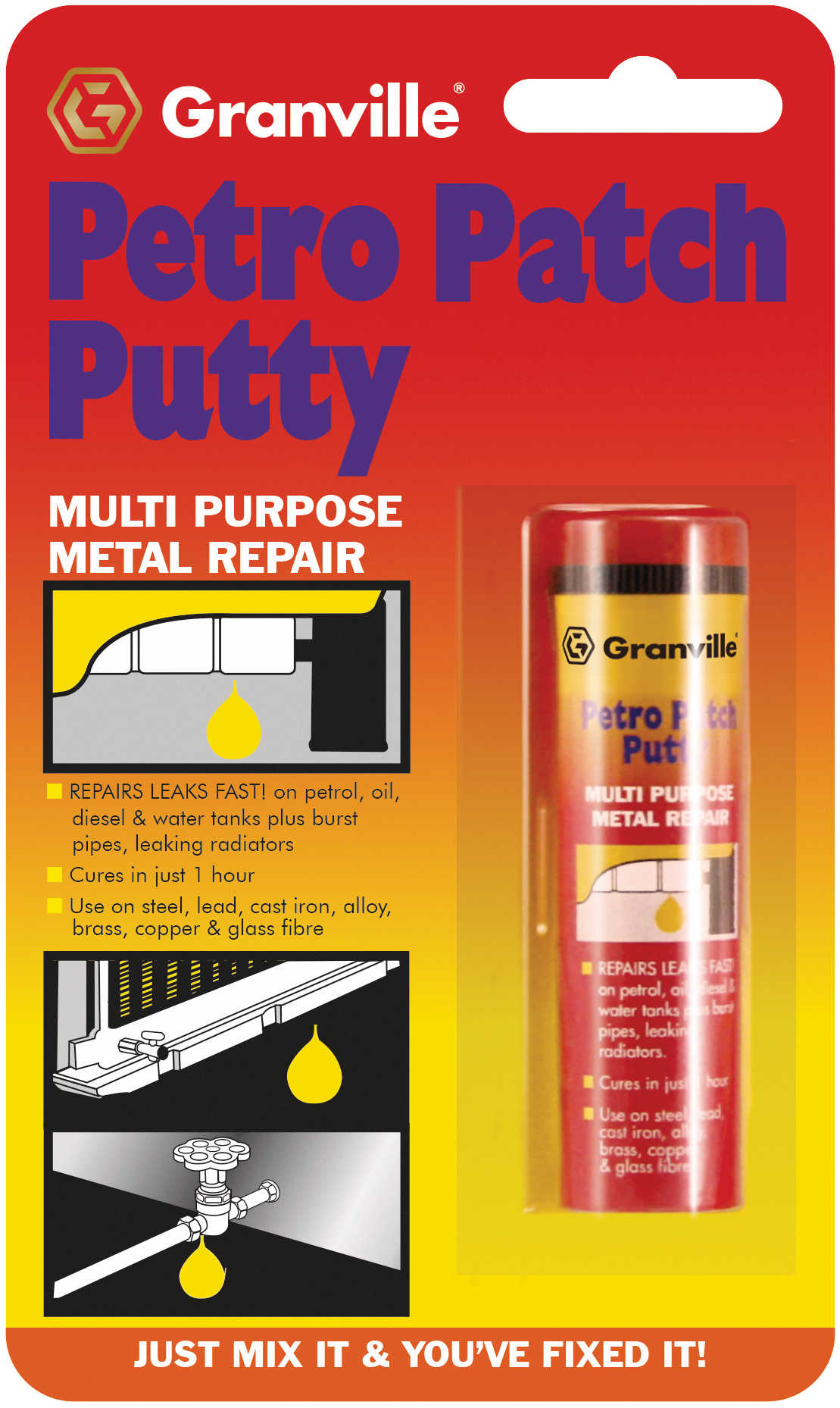 Granville Petro Patch Putty is a hand kneadable, non-rusting, steel reinforced epoxy putty that mixes in one minute to provide a fast permanent repair to items made of ferrous metals and aluminium. Granville Petro Patch Putty is supplied in a handy rod form with the curing agent encapsulated in the contrasting colour base material. Its putty-like consistency eliminates drips and runs providing a 'no mess' application with no tools required for use. Granville Petro Patch Putty dries to a dark grey colour which can be overpainted if required.
