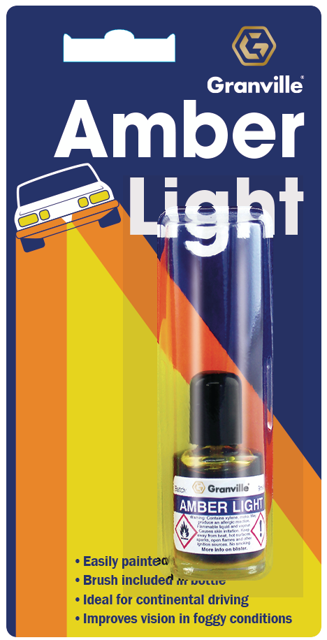 Granville Amberlight is a low viscosity amber coloured lacquer specifically designed for application to motor vehicle headlamps. Amberlight dries in 10-15 minutes to form a transluscent amber coating which is suitable for continental driving.